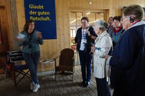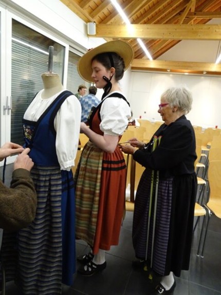 Die Trachten, ein interessantes Thema. Unsere Gäste hören den Ausführungen von Helen und Margrit aufmerksam zu.